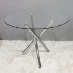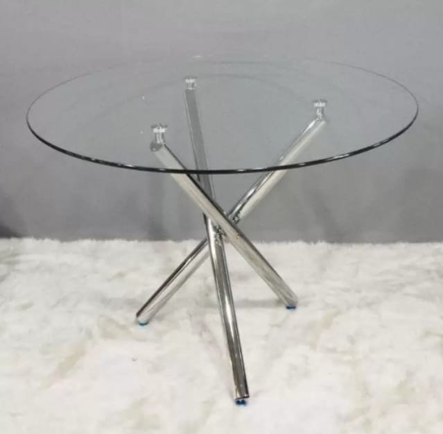 Mesa Canadá redonda de diseño hecha en tapa vidrio de 8 mm de espesor, estructura metálica cromada y topes antideslizantes.