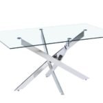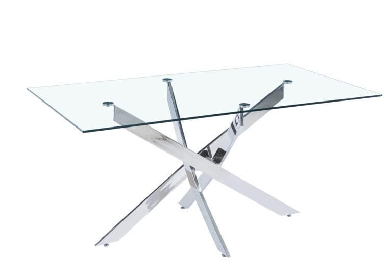 Mesa rectangular de diseño hecha en tapa vidrio de 10 mm de espesor, estructura metálica cromada y topes antideslizantes.