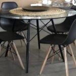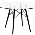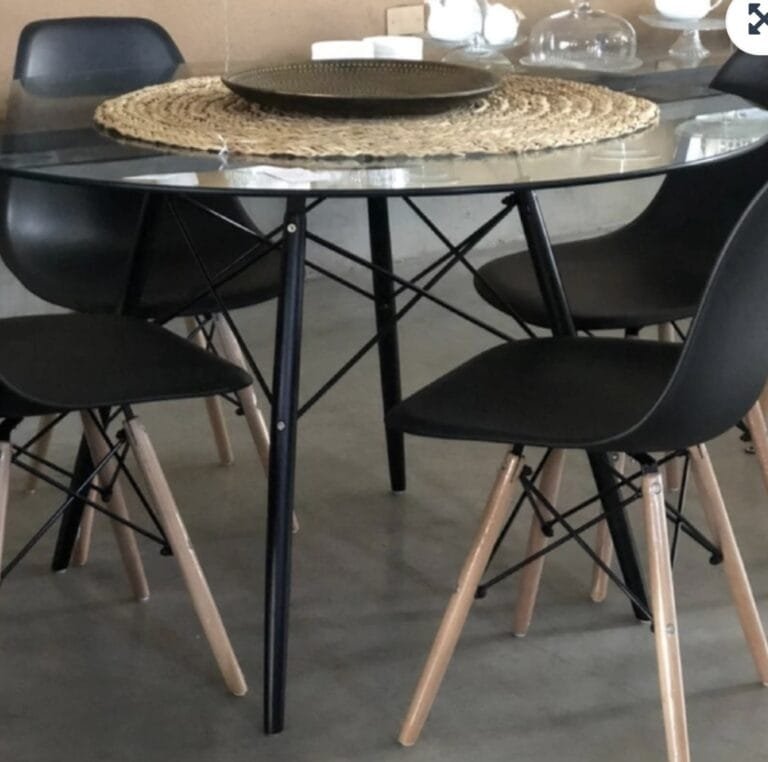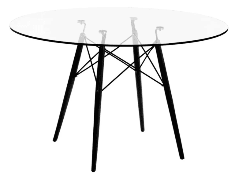 Mesa Eames redonda de diseño hecha en tapa vidrio de 8 mm de espesor. estructura metálica y patas de madera color negra. Articulo importado de calidad premium. Producto para armar. Incluye todo lo necesario para su armado . Medidas 110x75cm