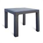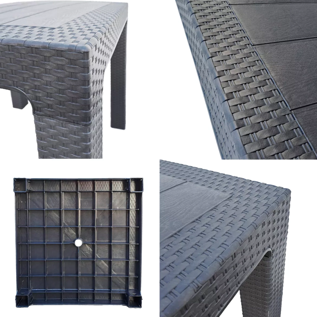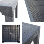 Mesa cuadrada de plástico con diseño simil rattan. Estructura robusta, firme y resistente. Con orificio para sombrilla.