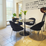 Juego de comedor mesa tulip pie central 100 cm + 4 sillas live estructura metálica y tapizado en pana