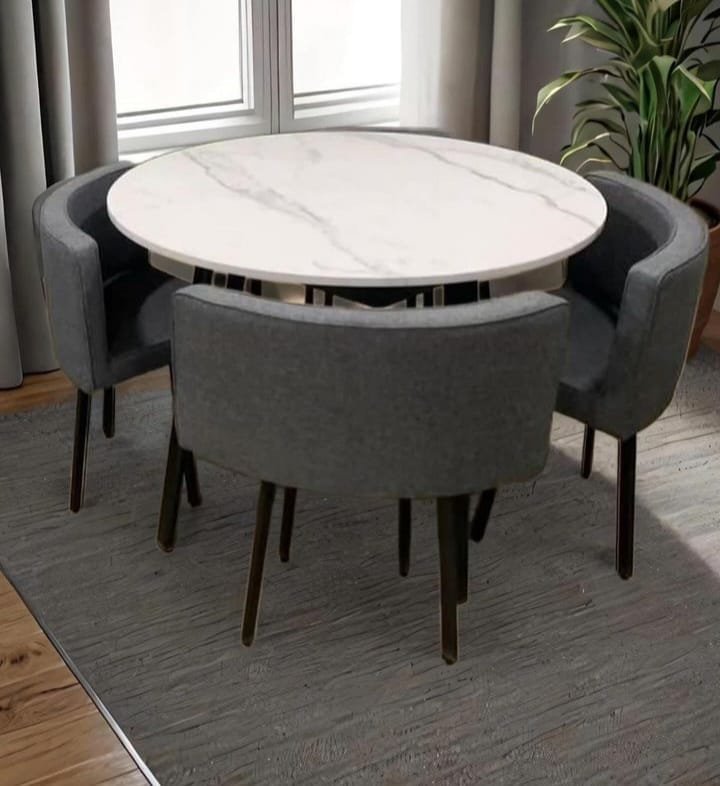 Mesa redonda de diseño hecha en madera (MDF) con acabado de veneer paper (la chapa de madera es un corte de madera “delgado como el papel” que se adhiere, mediante pegado o prensado al MDF. Color mármol. Patas de metal con recubrimiento de polvo . Medidas: 100x75cm