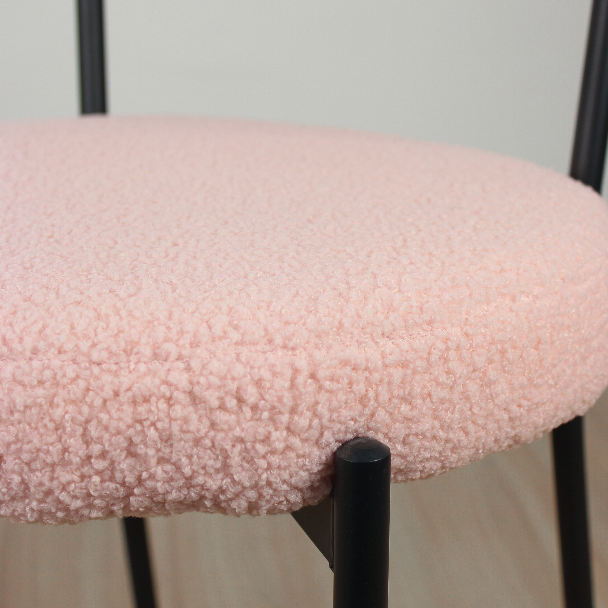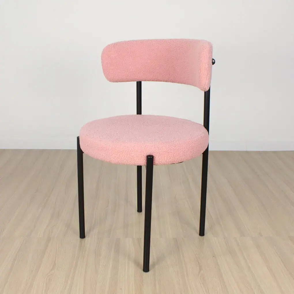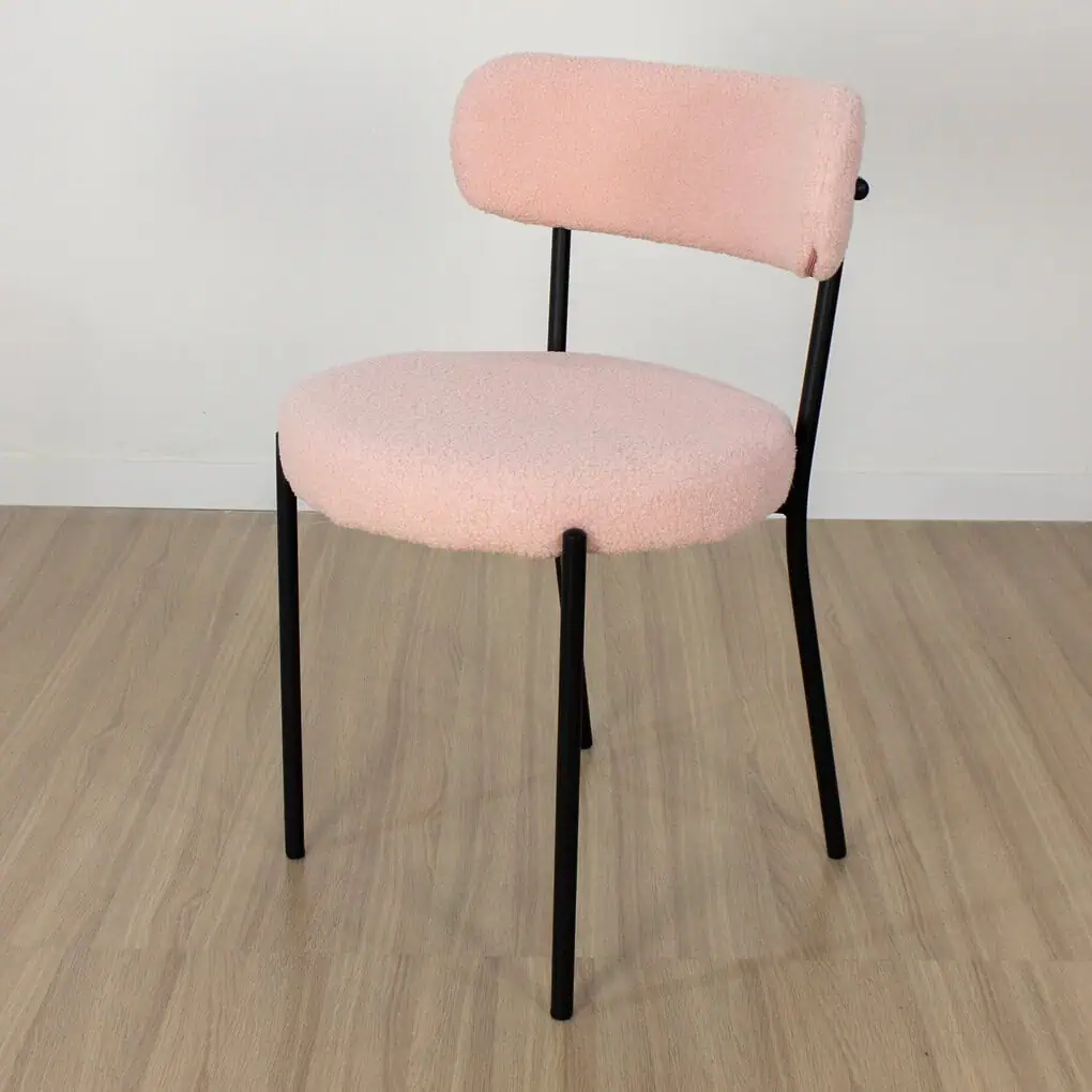 Silla de estructura metálica patas de acero con recubrimiento de polvo negro, asiento tapizado en tela boucle antimancha rosa o blanco. Medidas 56x54x75 cm. al asiento 46 cm . Super resistentes. sencilla de armar. incluye lo necesario para hacerlo. Articulo importado.