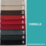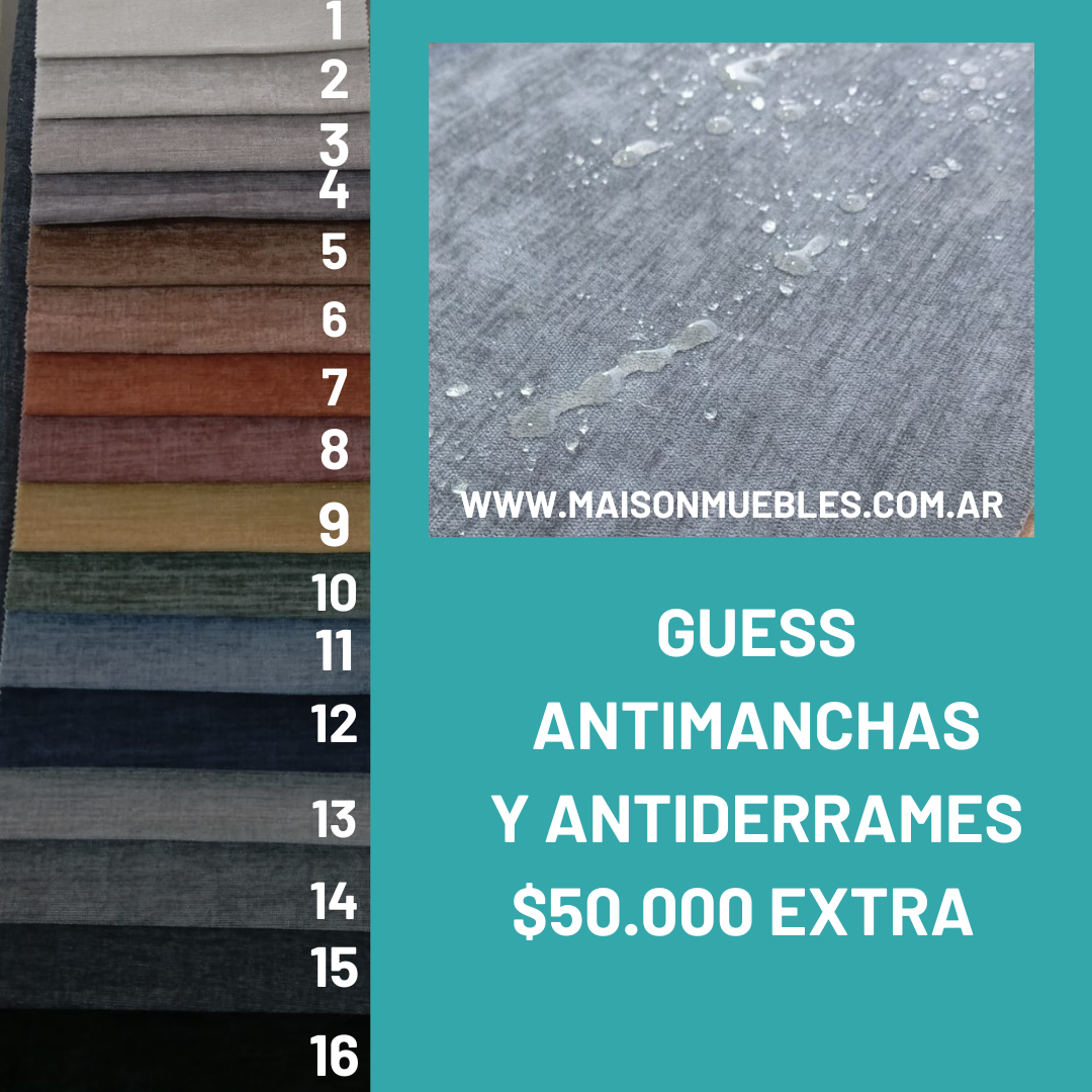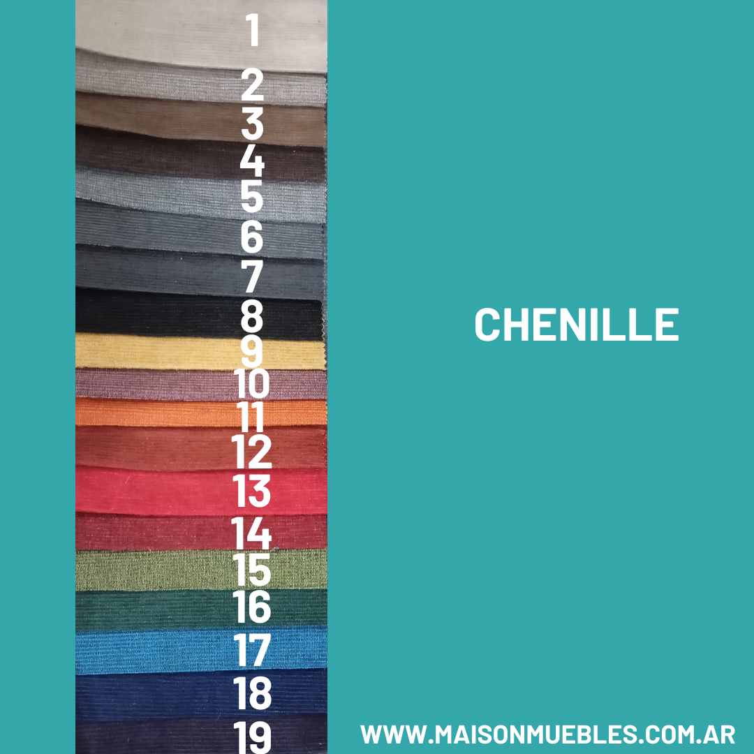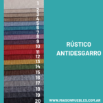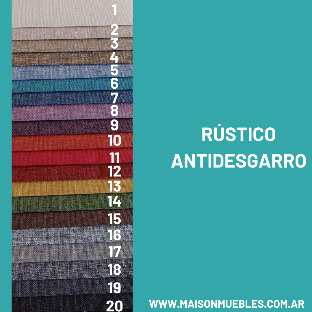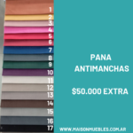 | Telas | Pana, pana antimanchas, chenille, lino, rústico antidesgarro, talampaya símil cuero glamour glamour, talampaya símil cuero Amaya |
